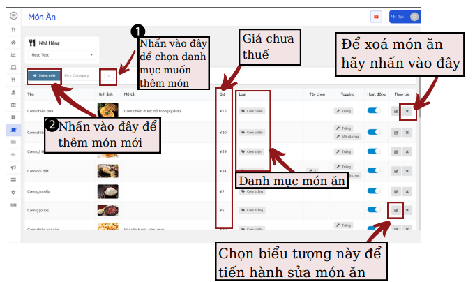 Lưu ý: thứ tự món ăn sẽ hiện thị lần lượt theo thời gian tạo món, món tạo ra trước sẽ hiện thị trước,món tạo ra sau sẽ hiện thị sau.Và thứ tự món ăn sẽ không thể sắp xếp lại được.