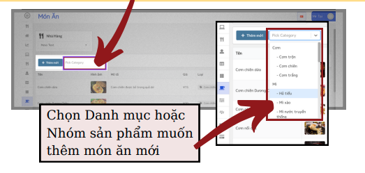 Lưu ý: Trước khi thêm mới món ăn bắt buộc phải chọn danh mục sản phẩm tại ô danh mục tại đây