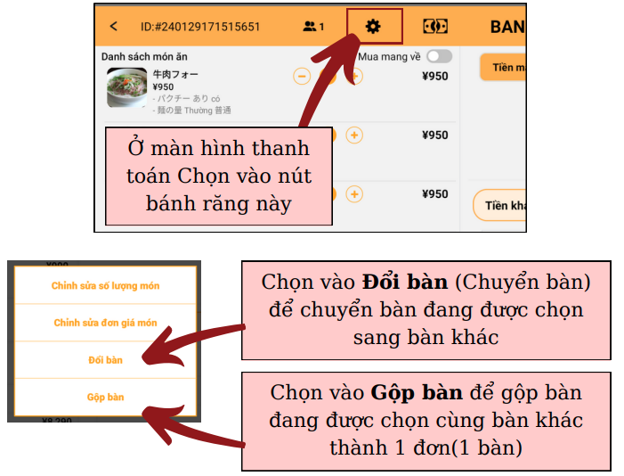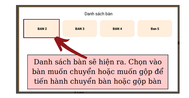 Lưu ý: Khi chọn gộp bàn vui lòng chú ý không chọn sai bàn. Khi đã gộp thì không thể tách lại (quay lại) như trước khi gộp được