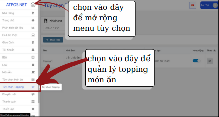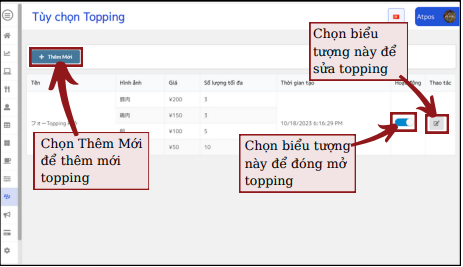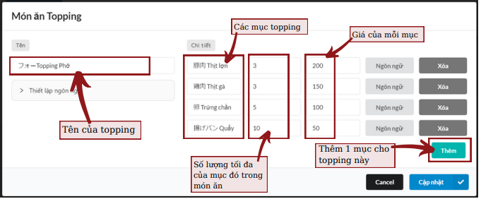 Sau khi điền đầy đủ thông tin. Nhấn vào nút OK để thêm topping mới hoặc Cập Nhật để lưu chỉnh sửa topping sau khi sửa nội dung.